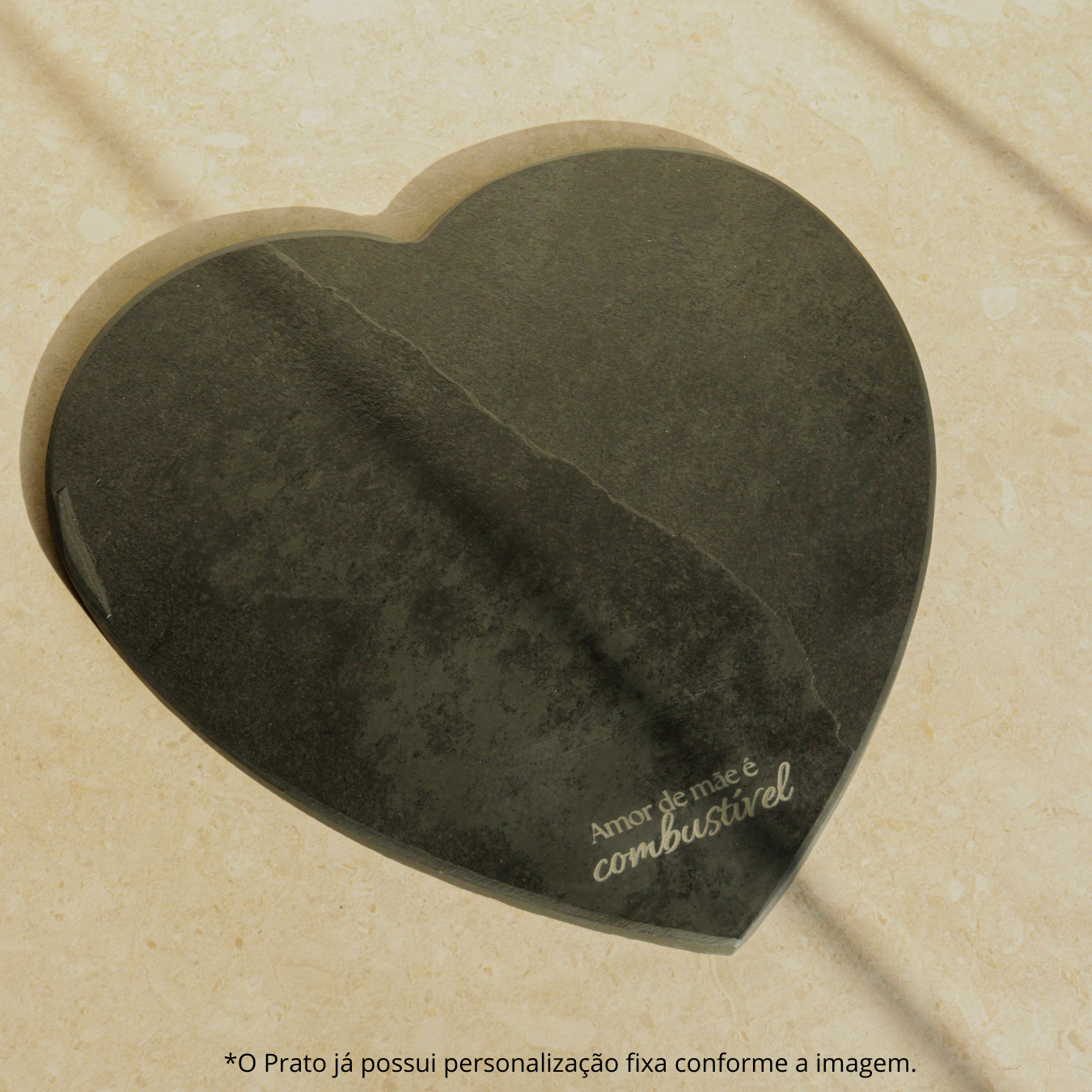 Em formato de coração e 100% natural, o Especial Prato Coração já vem gravado com uma frase fixa. Esse modelo contém a gravação "Amor de mãe é combustível". Para presentear aquelas que nos impulsionam a sempre ir em frente.