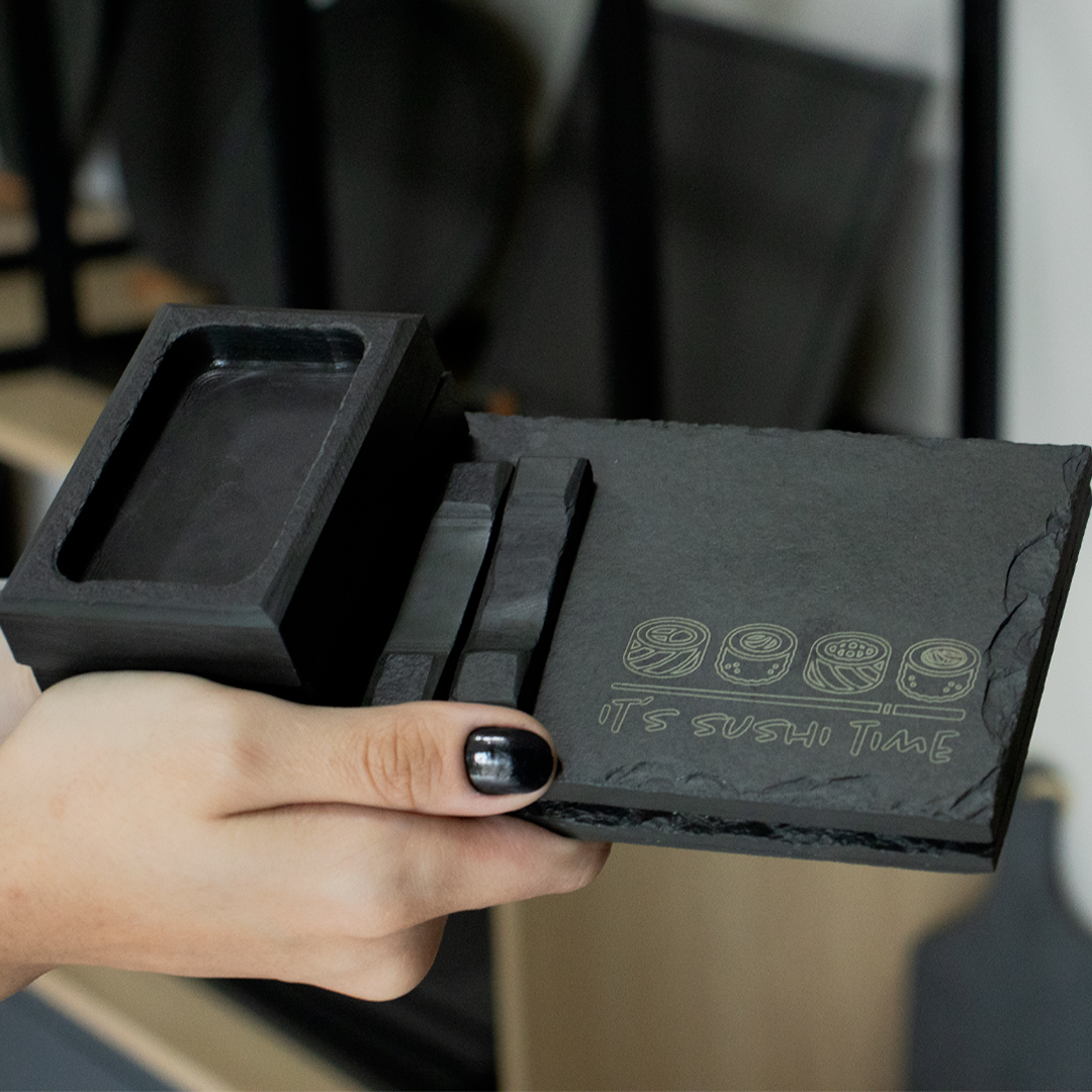 Composto por 2 Pratos Retangulares Ardósia Grafite 10x20cm personalizados com uma gravação fofa de sushis e com a frase "IT'S SUSHI TIME", 2 Molheiras Ardósia Grafite, 2 Apoios para Hashi Ardósia Grafite e 2 Hashi de Bambu, o Kit é a escolha definitiva para quem busca uma experiência gastronômica refinada e inesquecível para duas pessoas.